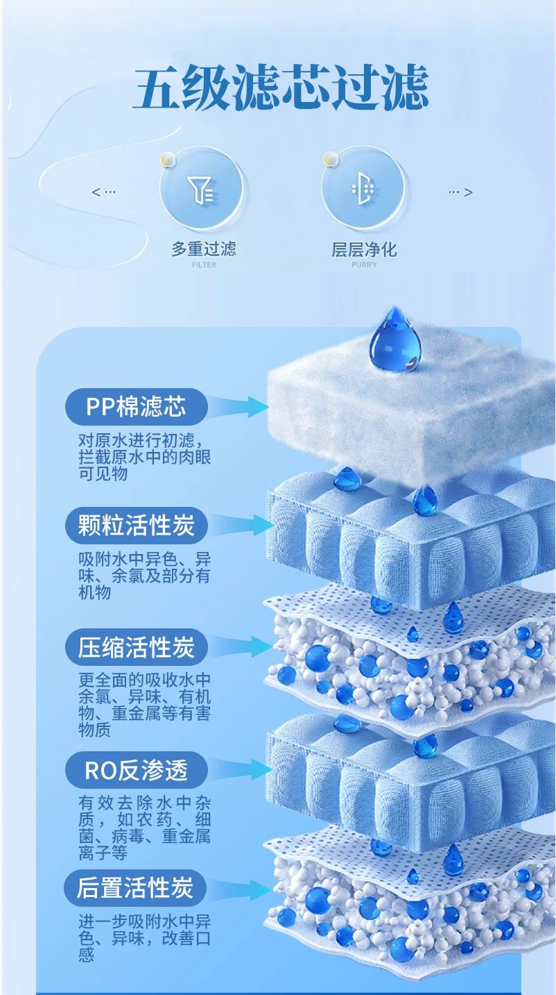 配置五級RO反滲透過濾系統,能夠有效過濾水中雜質,確保每一滴水的純凈與安全