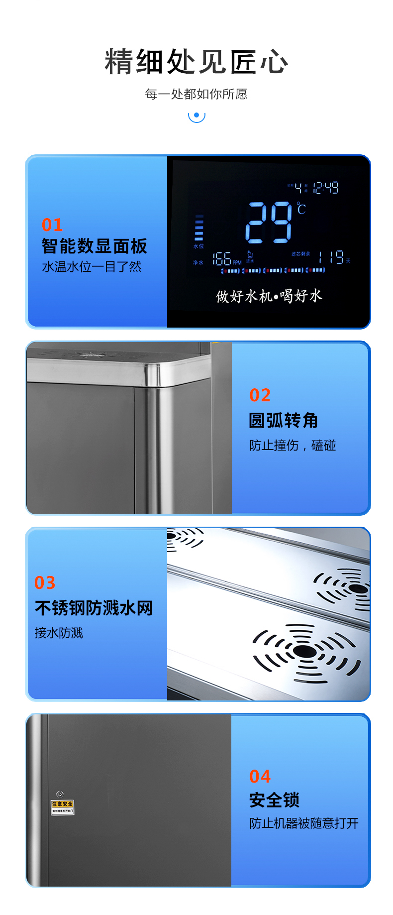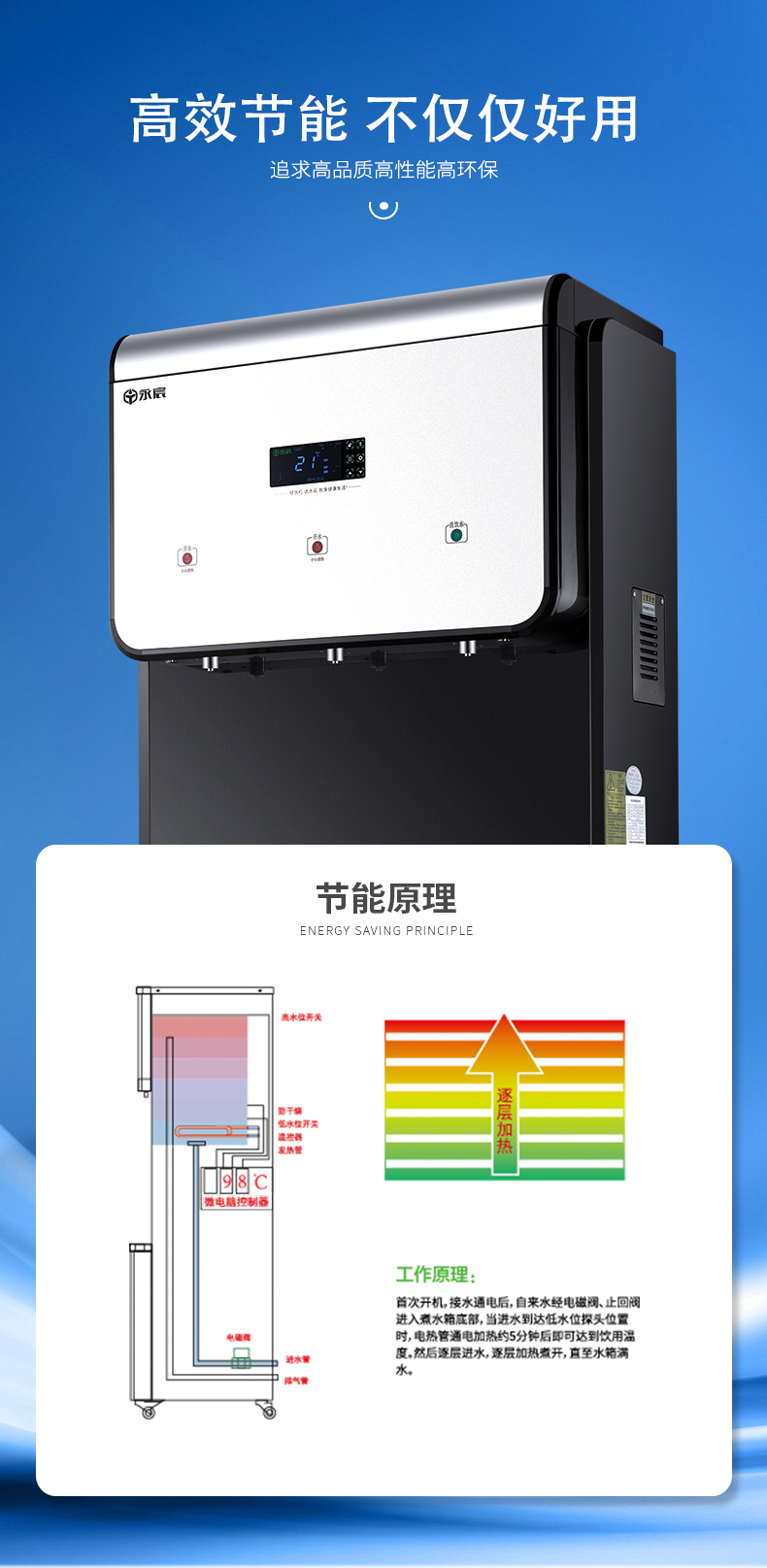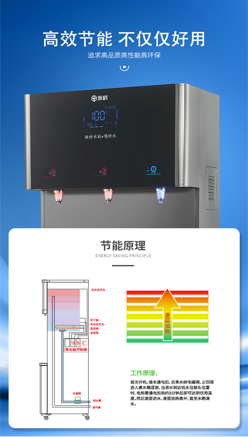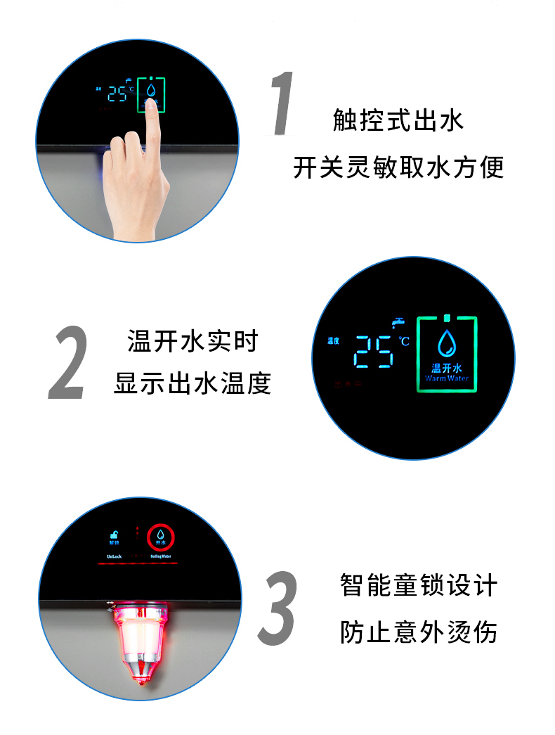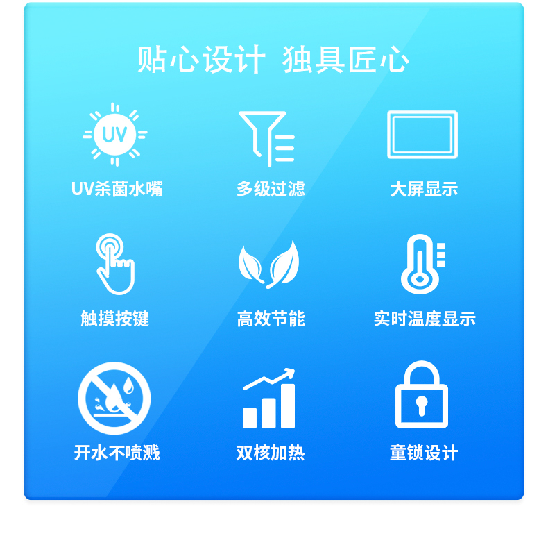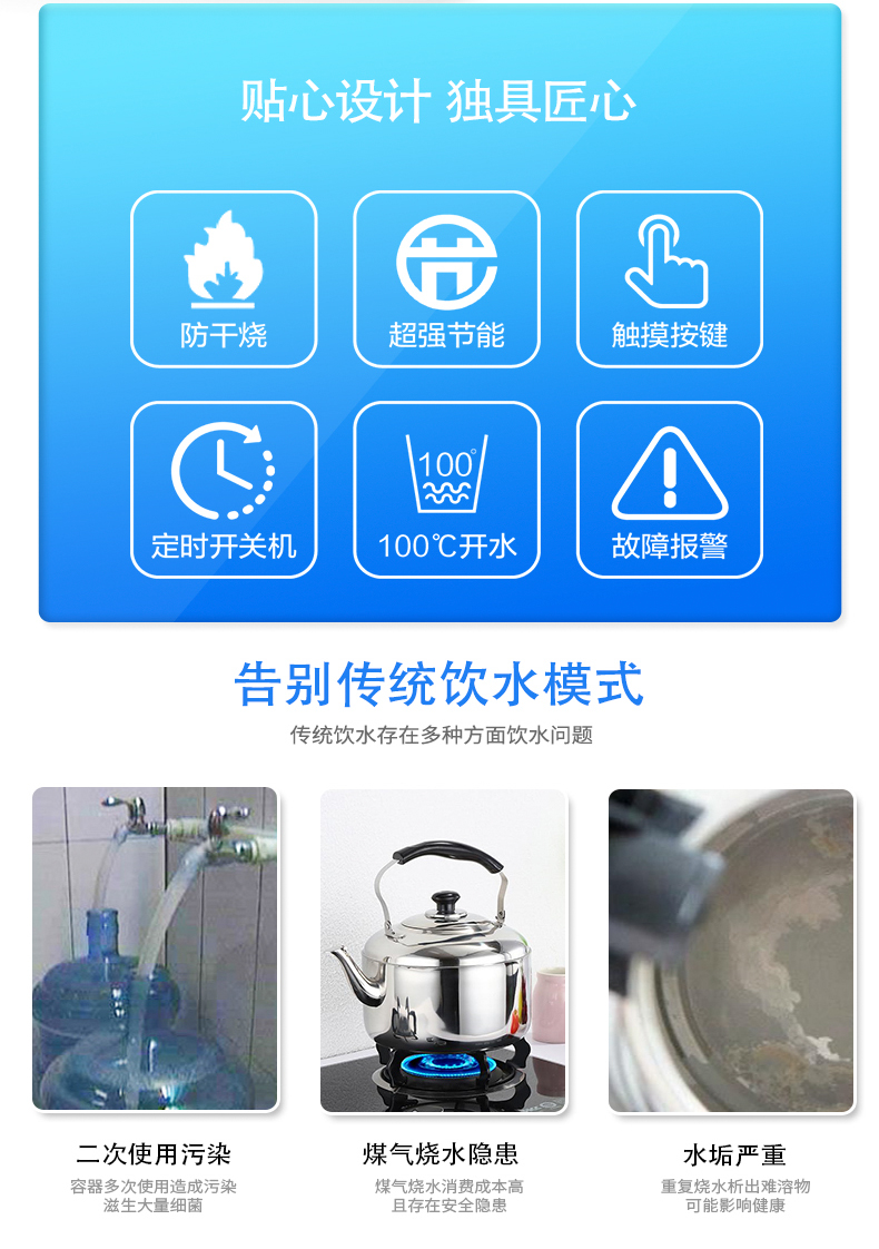 它高大上的機器外形搭載雙核加熱技術,24小時不斷提供溫開水,杜絕千滾水,為你提供干凈衛生的飲用水環境。