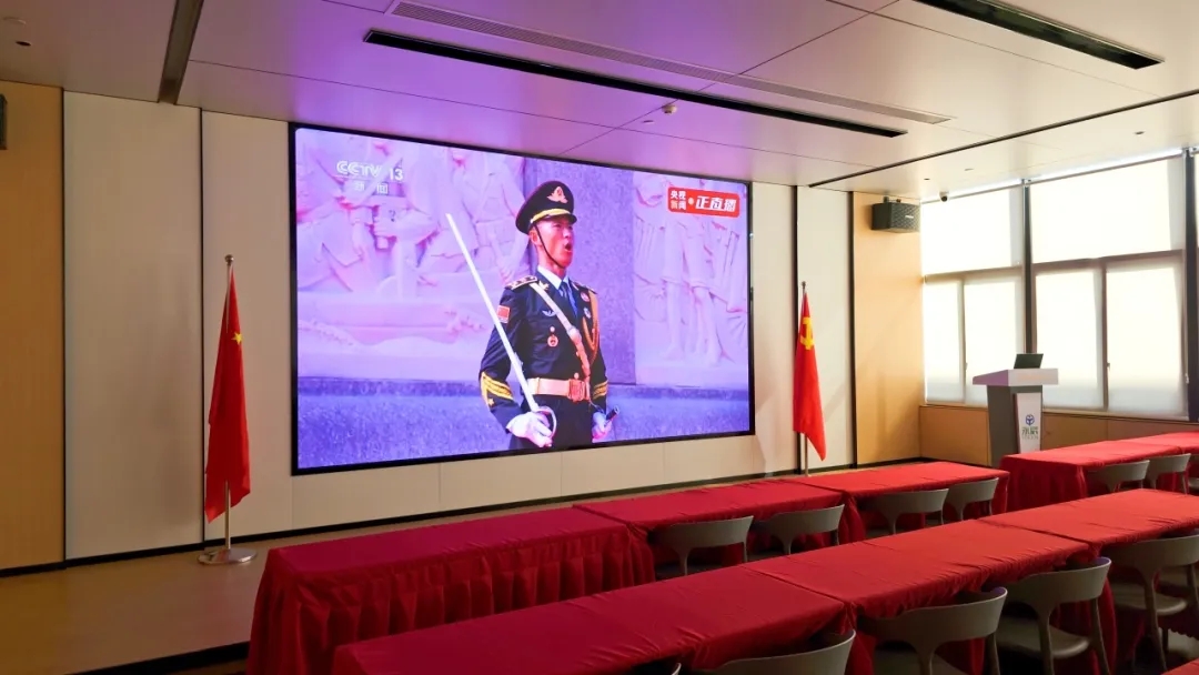 培訓室內,五星紅旗在投影屏兩側莊嚴佇立,與屏幕中的天安門廣場遙相呼應。