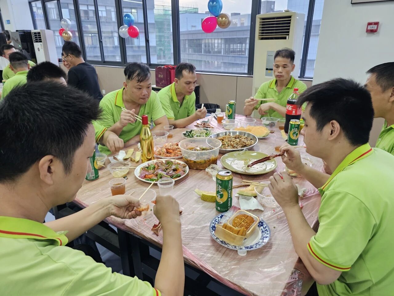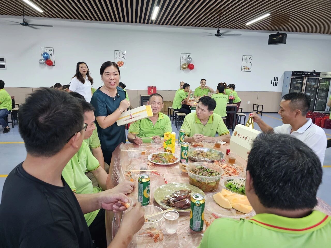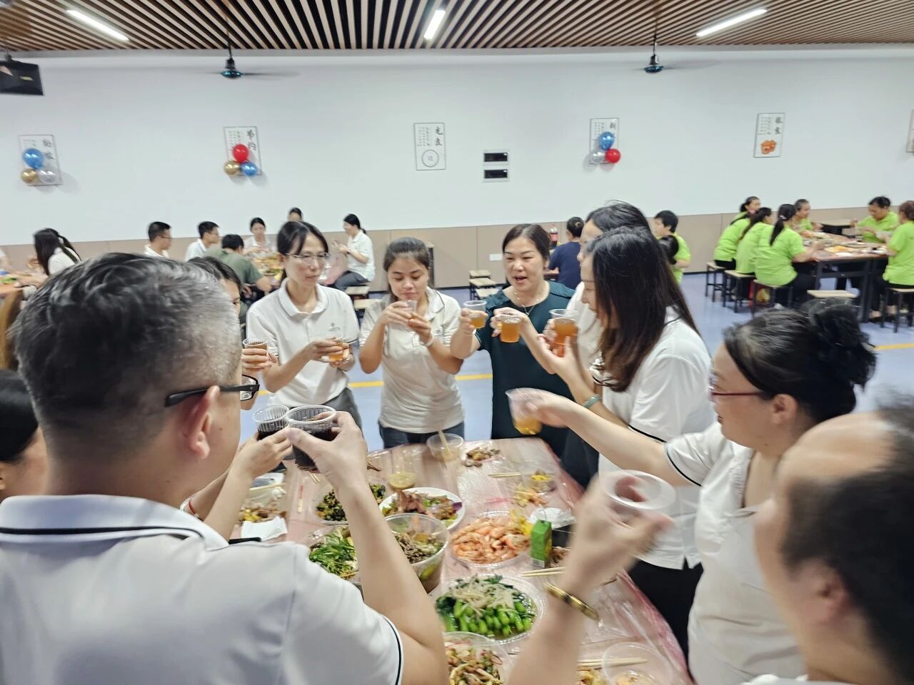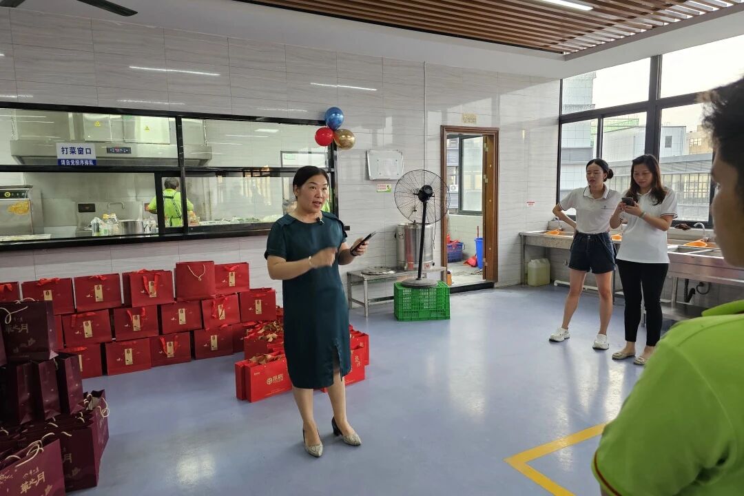 員工食堂經過悉心布置,紅色桌布、五星紅旗與精致的氣球相互映襯,洋溢著濃厚的節日氛圍。