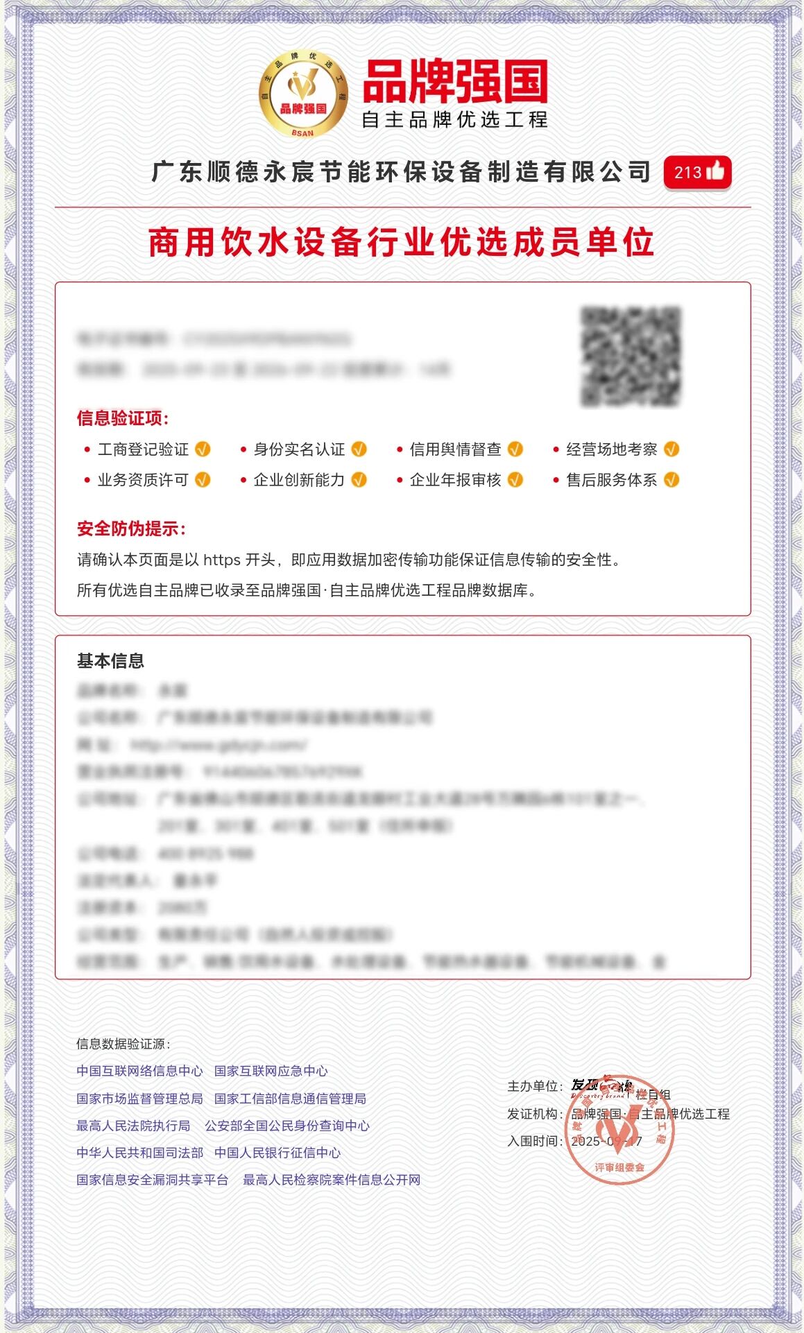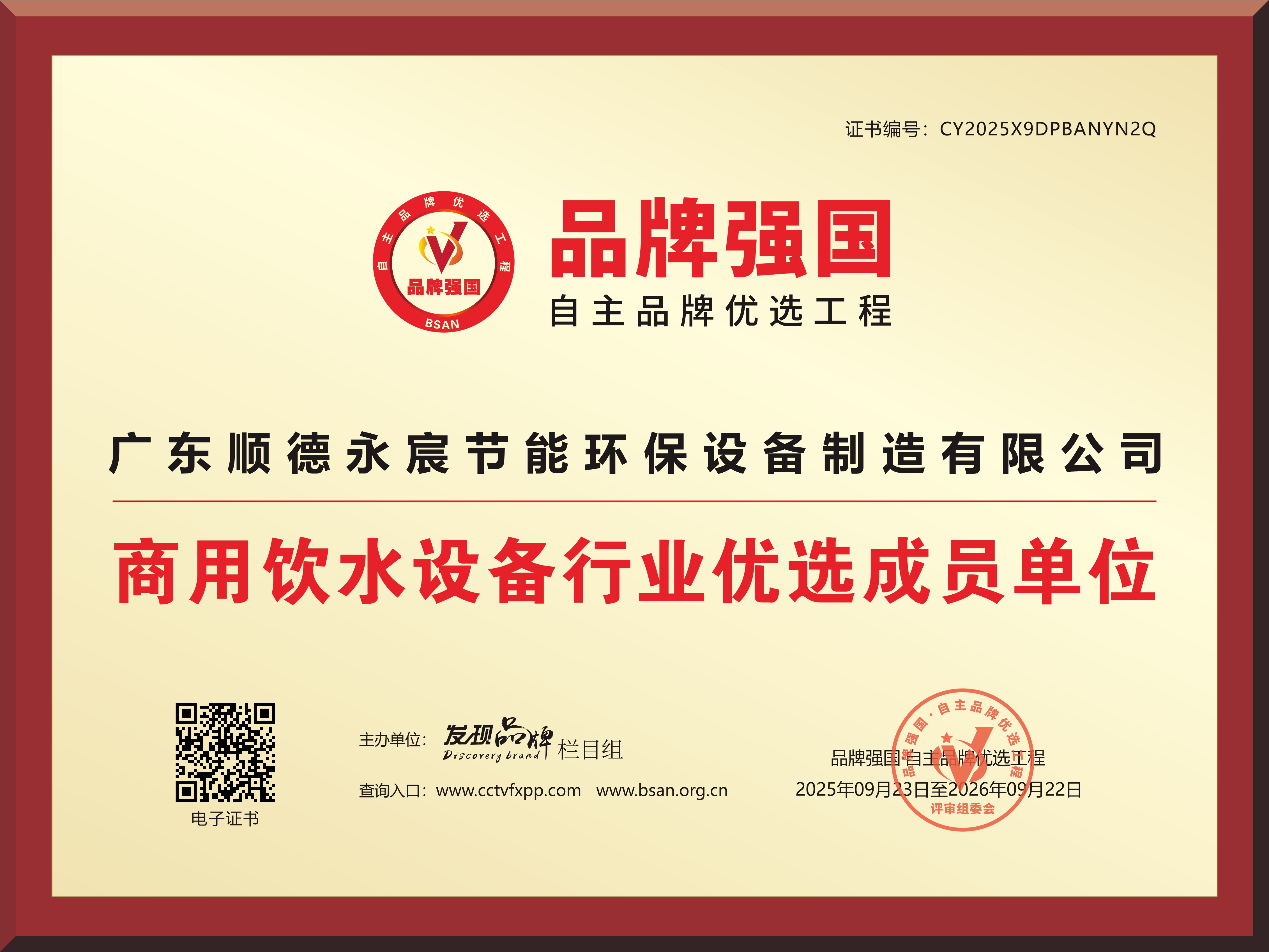 近日,廣東順德永宸節能環保設備制造有限公司通過國家“品牌強國自主品牌優選工程”多維度嚴苛評審,正式入選成為商用飲水設備行業優選成員單位之一。