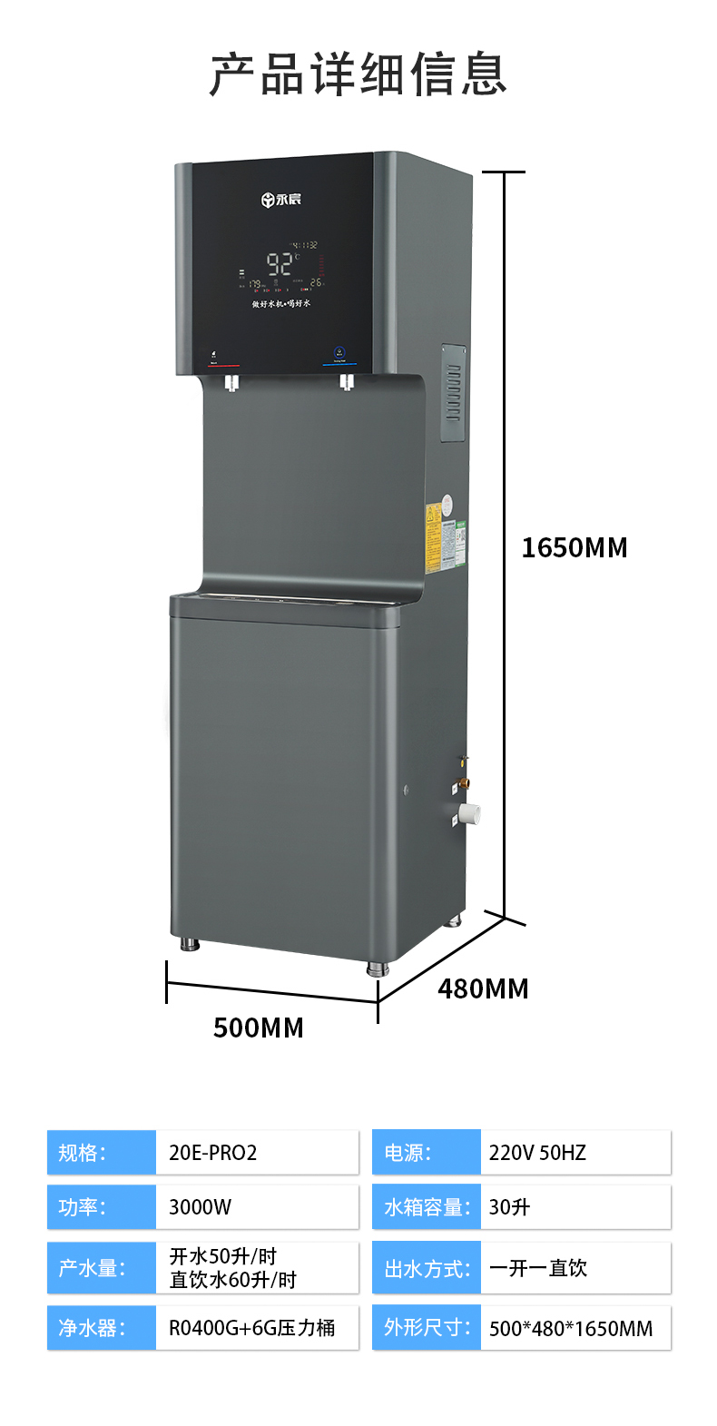 產(chǎn)水量:開水50L/H;直飲水60L/H